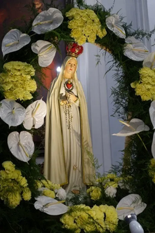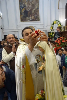 Domenica mattina, durante la Santa Messa delle 11.30 animata dal coro dei bambini, sotto lo sguardo materno di Maria hanno ricevuto per la prima volta Gesù Eucarestia 31 bambini della parrocchia. La Santa Messa serale è stata invece presieduta dal nostro vescovo Mons. Pietro Lagnese e, al termine, abbiamo vissuto momenti di grande emozione durante la fiaccolata svolta all’interno della cattedrale stessa, illuminata solo dai flambeaux, e con una cascata di petali di rose al canto del “13 maggio”. Gli occhi di ognuno di noi puntati sullo sguardo tenero di Maria, come se Lei dialogasse singolarmente con ciascuno di noi! Il parroco,, grazie alla generosità dell’associazione Madonna di Fatima, poi ha distribuito a tutti di una corona del rosario in legno con libricino. Martedì 24 maggio, a conclusione della missione, la S. Messa è stata celebrata all’aperto, animata dal bellissimo e numeroso coro delle mamme, in un tranquillo angolo immerso nel verde. Don Carlo ci ha fatto dono ancora una volta di una bellissima e significativa omelia e ha poi ha fatto la consegna del’ottava icona per l’apostolato di Maria, che nella nostra parrocchia è presente dal mese di settembre dello scorso anno. Prima della benedizione finale, sono state bruciate le lettere scritte a Maria da tutti noi nel mese di maggio e lasciati volare via tanti palloncini bianchi e azzurri che hanno portato con se i fioretti di questo mese. E, dopo una profonda meditazione su Maria, il parroco ha ringraziato di cuore gli Araldi del Vangelo per quanto in questa missione ci hanno donato, ha fatto la foto con loro e con i coordinatori delle icone e ci ha benedetti. Gli araldi hanno donato un bellissimo quadro della Madonna di Fatima con un piccolo riquadro che riprendeva l’incoronazione fatta il primo giorno dal nostro parroco don Carlo.