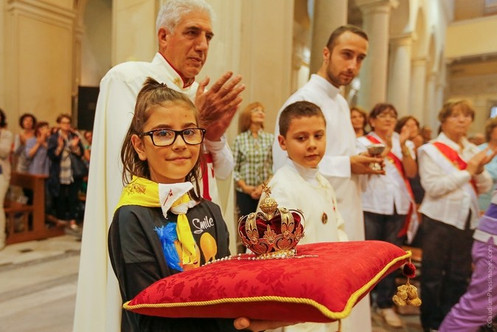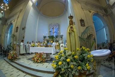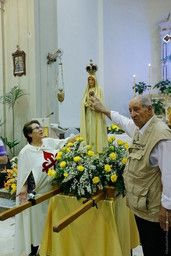 Nello stesso giorno di 14 Ottobre, dopo la visita all’ospizio dei Piccole Suore dei Poveri, la Madonna ha proseguito fino alla parrocchia di San Nicola di Bari, dove è stata ricevuta solennemente dal rev. Padre Pietro Scolaro. Dopo l’incoronazione e la recita del rosario meditato, c’è stata la Santa Missa animata dal coro e dalla banda degli Araldi del Vangelo. Durante la santa Messa padre Pietro Scolaro ha dato in omaggio agli Araldi nella persona del Rev. Padre Carlos Werner una placca della Madonna della Lettera. La parte più emozionante della giornata è stata la processione in ginocchio realizzata dentro la parrocchia per venerare la Madonna e chi ha iniziato la processione è stato lo stesso parroco rivestito dei suoi paramenti sacerdotali. Varie persone piangevano all’avvicinarsi della Madonna. Dopo questa cerimonia Lei ha proseguito in processione per le vie accompagnata